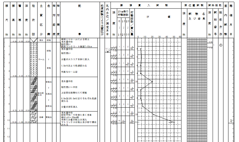 ボーリング調査の結果は、下記のような柱状図で記録されます。それぞれのデータについて簡単にご紹介します。